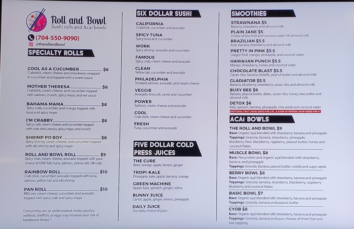 Located in Albemarle, NC, Roll and Bowl is a culinary delight that brings a fresh twist to sushi and poke dishes. Their specialty rolls, such as the Cool As Cucumber Crabstick and the Bahama Mama, artfully combine flavors that dance on your palate, each starting from just $7.50. If you're seeking simplicity, the Cucumber Maki and Avocado Maki are delightful options at a budget-friendly $5.